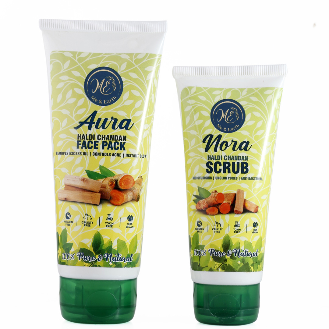 The Traditional Haldi Chandan Combo by Me and Earthcomprises one pack of Nora- Haldi Chandan scrub and one pack of Aura – Haldi Chandan Face Pack.