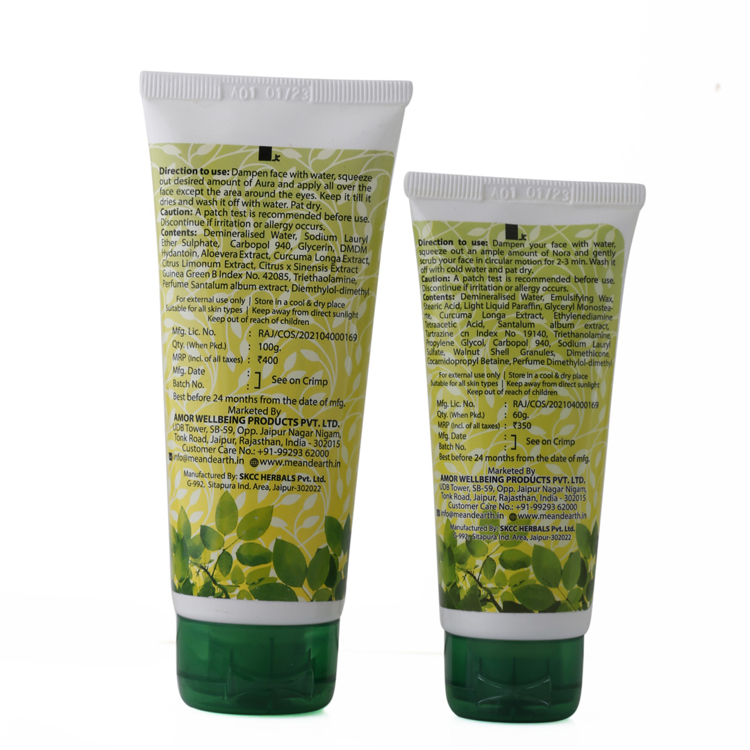 - Aura is a 100% natural product and does not have any chemicals. Also, it suits all skin types and gives the best results when used with Nora – Haldi Chandan scrub.